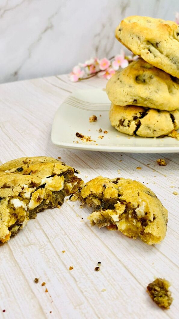 Deliciosas Cookies New York rellena de chocolate Blanco en pequeños trocitos, y un manjablanco casero preparado con leche condensada sin lactosa y leche ligth y sin lactosa , la unidad pesa 130 gramos, es crujiente por fuera y suave por dentro, la puedes disfrutar comiendo fria o caliente, y cuando la comes quieres seguir comiendo, es una delicia.